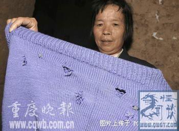 内容——32年来,江津杜市镇梅弯村6社住在半山腰的村民们没穿过一件完好的衣裤——他们不是没钱买,而是只要衣裤一离身,就会 莫名其妙地布满类似刀割的小口。这种现象一直持续到现在。 “衣服千万要抱到手上,不要放下哦!”昨晚,彭先育这样提醒刚进家门的记者,言毕满脸神秘,十分后怕的样子   照片上的人叫彭先育,今年56岁,江津杜市镇梅弯村6社人。1972年的夏天,她家就晾在屋外的衣服突然布满小如黄豆、大如拇指的洞,洞口如同刀割 般。