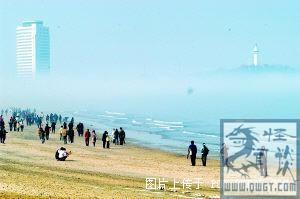 去年1月30日,烟台山出现罕见的海市蜃楼奇观,人间仙境蓬莱阁清晰浮现在烟台山上,在滨海景区观光的数百市民目睹了这一壮观场面。 中午12时左 右,记者接到报料,赶到金海湾大酒店门前海滩上,此时海市蜃楼逐渐消散,一团青色云雾仍笼罩烟台山灯塔上空,碧蓝的大海和跌宕的山峦还依稀可见。目睹海市 蜃楼奇观的烟台一中高一学生张海梦告诉记者,11时45分,她和两名同学放学路过滨海景区时,突然发现烟台山上空云雾弥漫,云雾中山、海、树等景观不时交 替出现,云雾也随景观的不同而变换颜色,一会青、一会蓝。. 在着神奇的自然奇观中,张海梦竟然看到了著名的旅游景点蓬莱阁,连阁上的琉璃瓦和石雕等,也 惟妙惟肖地清晰浮现。当时,滨海路上数百市民和过往车辆都停下,争相目睹这一奇观。