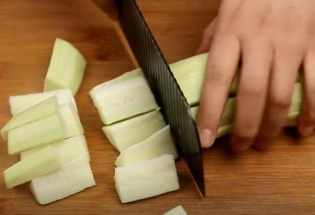 1.准备一根茄子去蒂,削去茄子外皮,用刀切成小段。